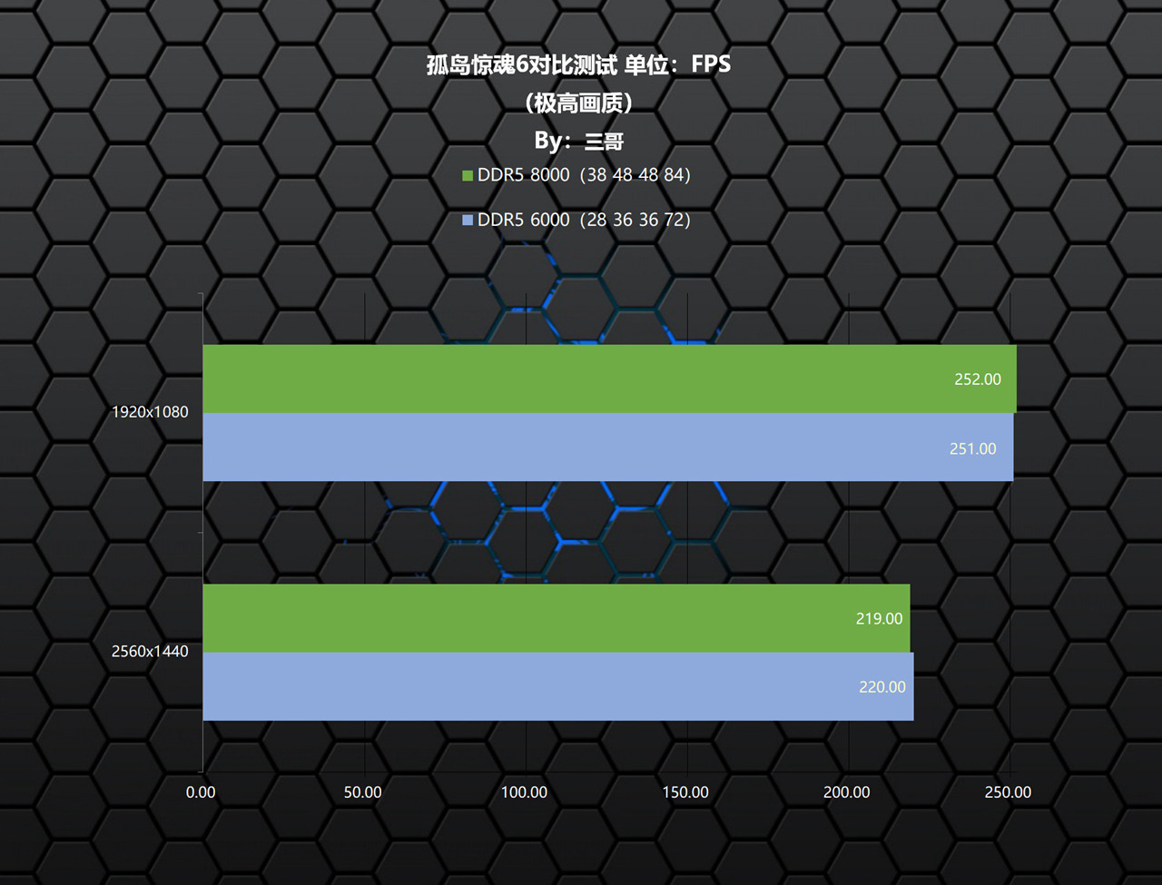 在《孤島驚魂6》測試中,高頻率和低時序的表現基本持平,其中高頻率在1920x1080分辨率下領先了1幀;在2560x1440分辨率下落後了1幀。
