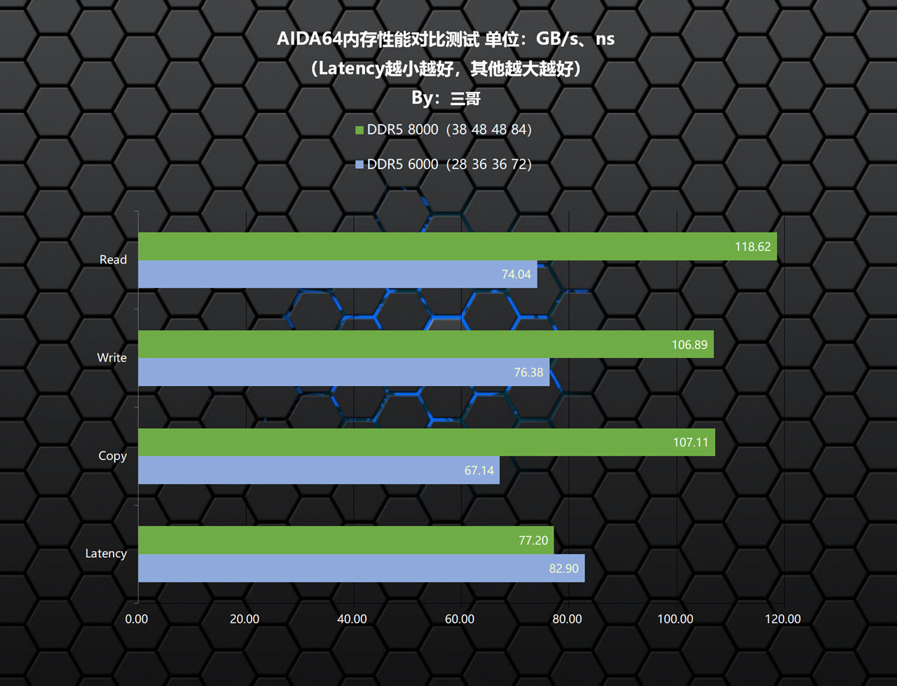在該測試中,高頻率相較低時序,內存的讀、寫和複製性能均有大幅度的領先,同時延遲也明顯降低。