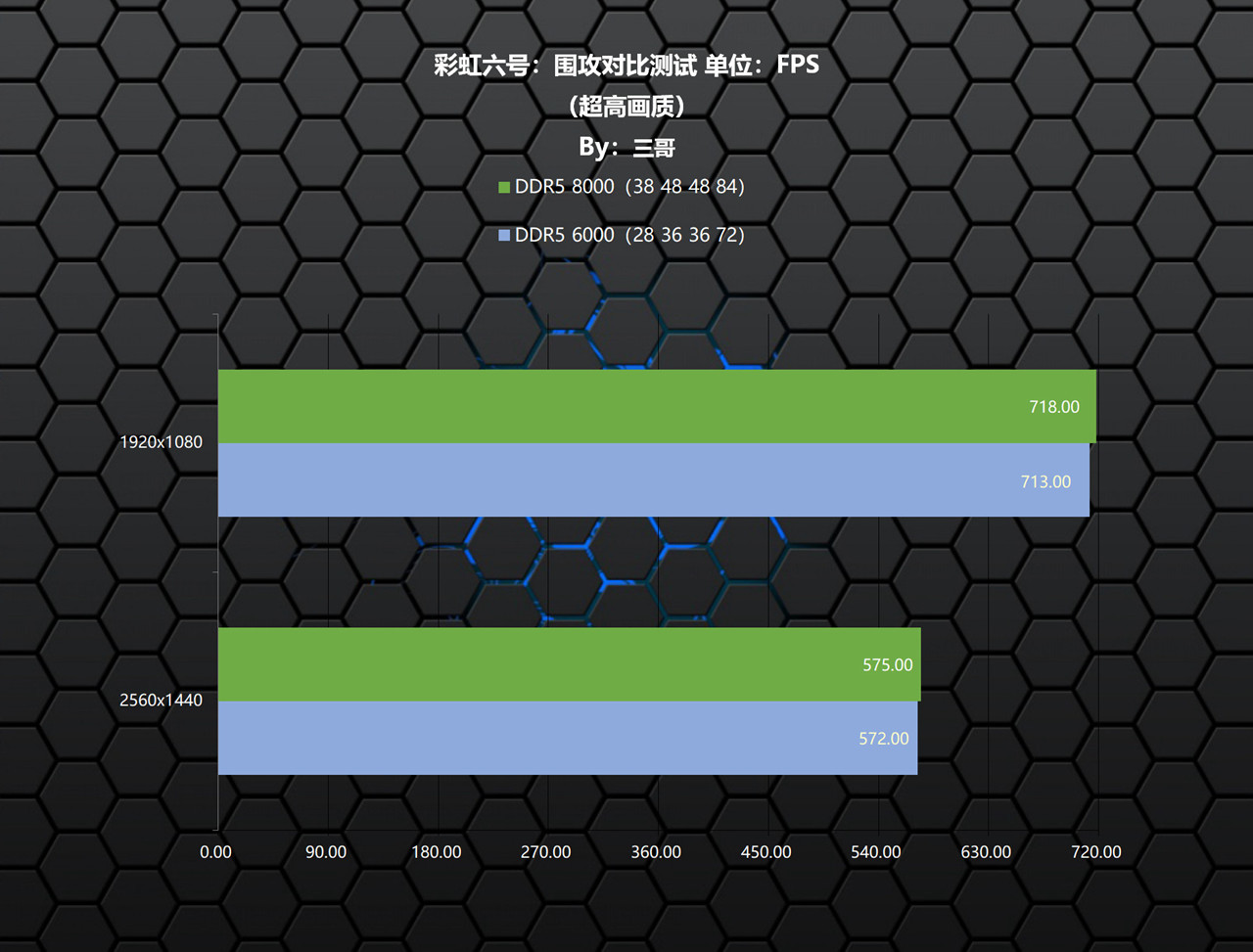 在《彩虹六號:圍攻》測試中,高頻率相較低時序有小幅度的領先,其中在1920x1080分辨率下領先了5幀;在2560x1440分辨率下領先了3幀。
