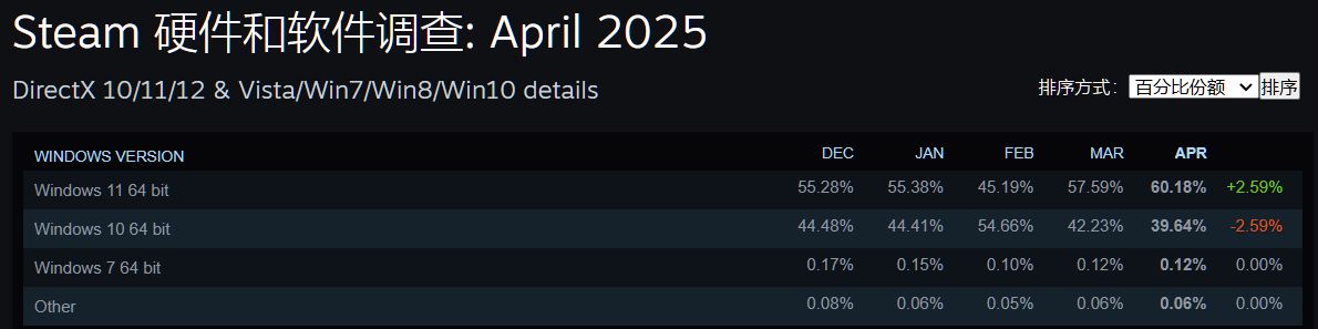 Windows 11一直被许多玩家诟病为操作复杂、UI体验不佳,但其在Steam玩家中的占有率已增长至60%: