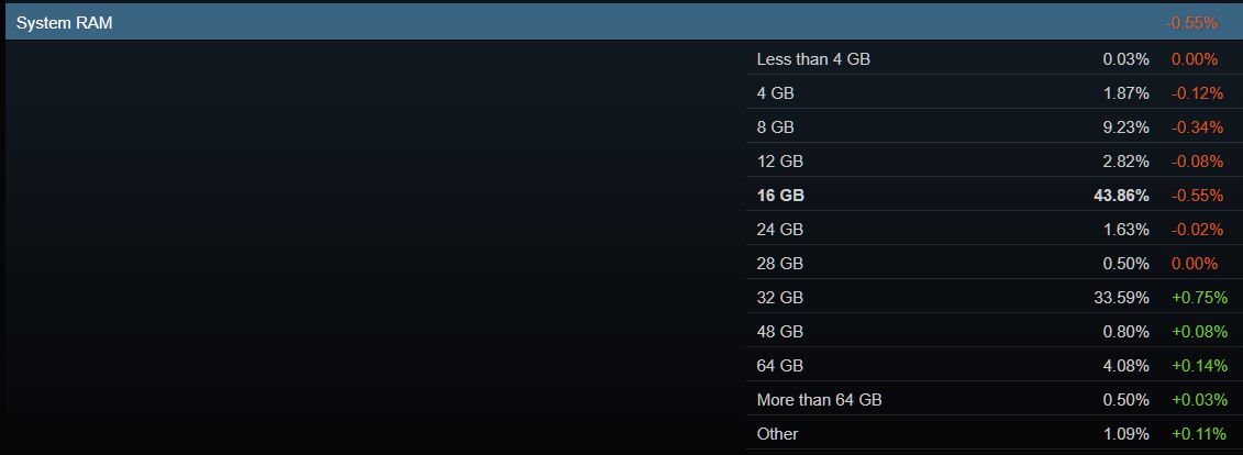 主流人群还在用16G内存,约占43%,其次是32G内存,约占33%,如图所示: