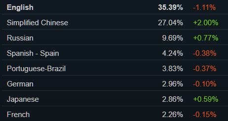 仅次于英文——Steam 27% 的用户使用简体中文,这代表Steam有约四分之一的中国玩家: