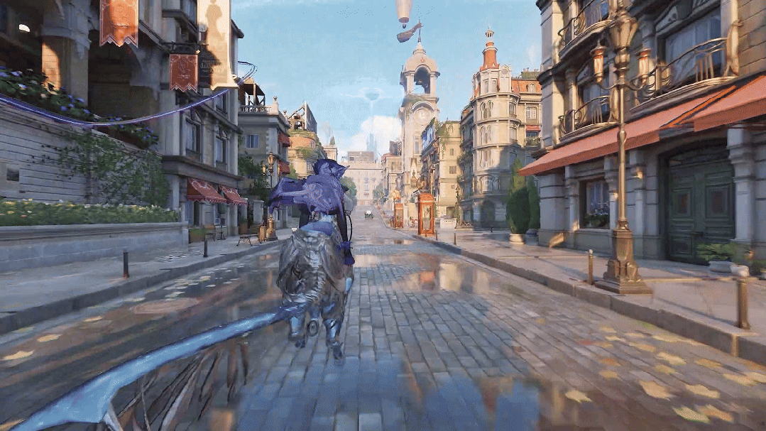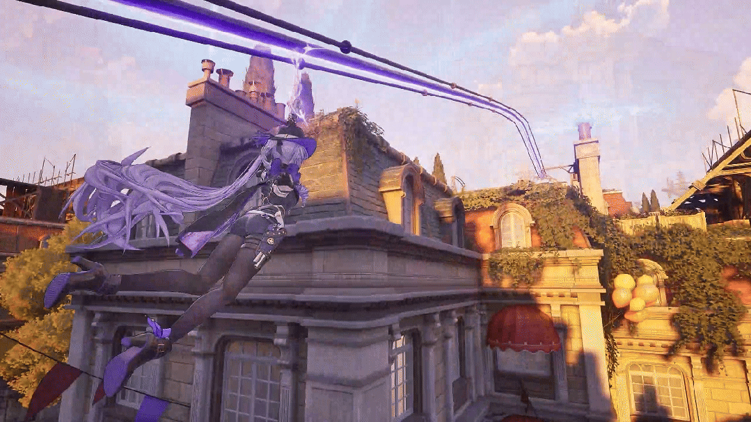仔细观察的话,你会发现城市中不少建筑物周围都安装有紫色滑轨。角色可以利用这些滑轨,在地面与房顶之间灵活地进行高低差移动。
