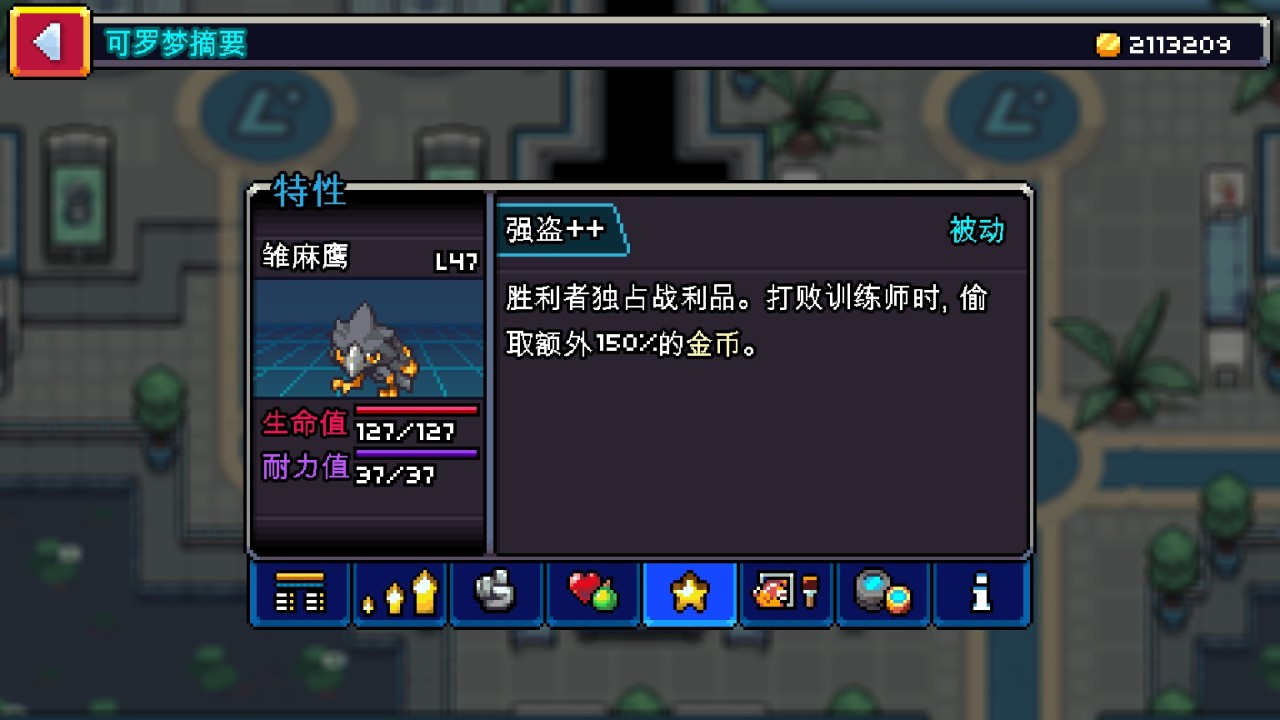 各項數值較爲均衡的家門工具鳥,可以偷錢,也可以學習技能“戰術猛擊”捉寵。