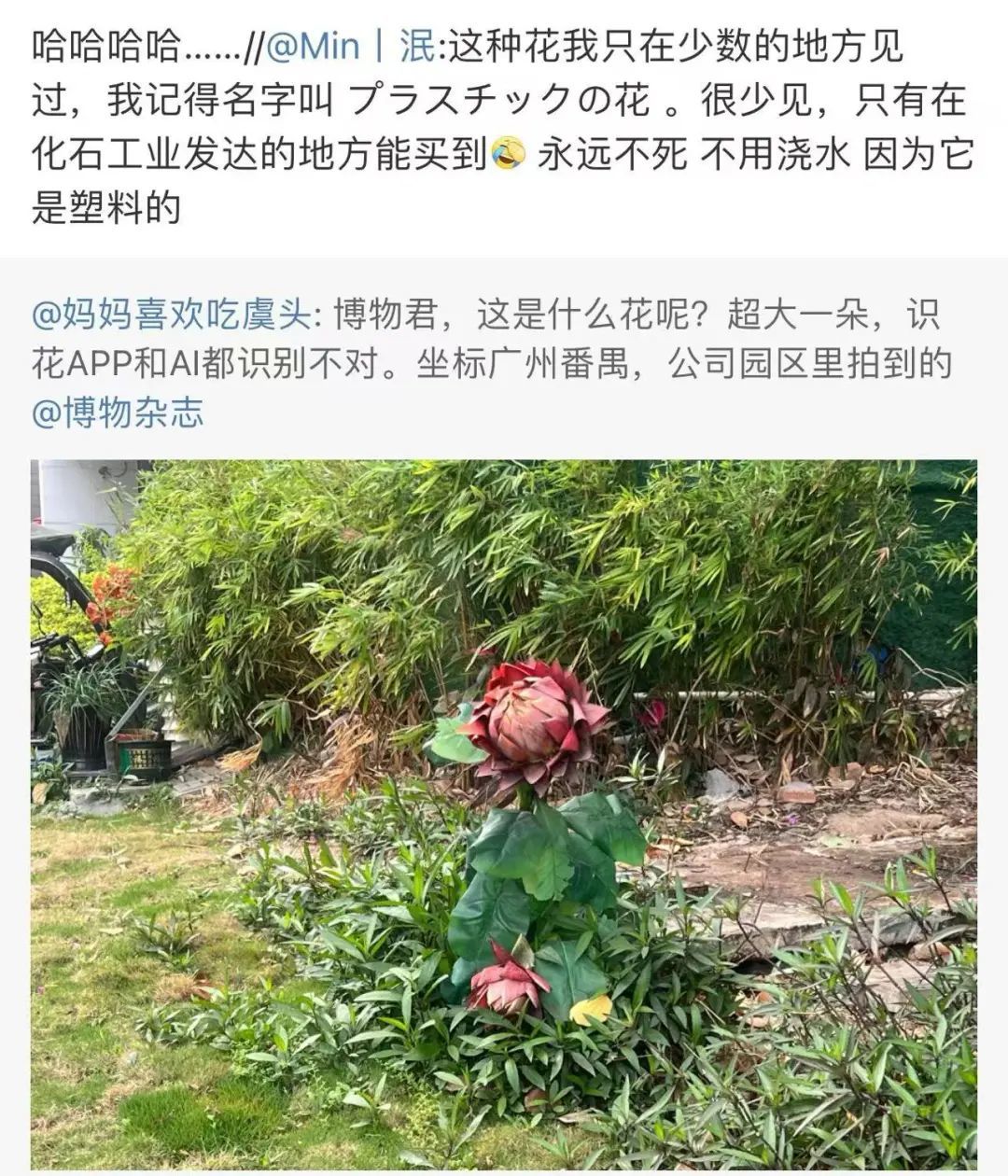 5月10日,廣州番禺,有網友在公司園區發現一株不認識的巨花,發帖求助博物雜誌,收穫熱心網友解惑。