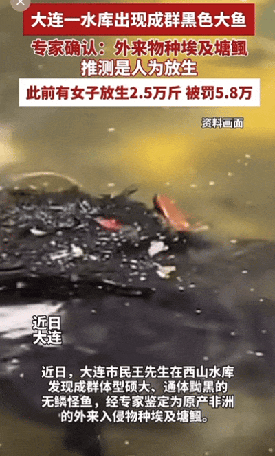 5月6日下午,遼寧大連,市民王先生在市區西北部一水庫發現一羣體型較大、通體黝黑的無鱗怪魚,經專家鑑定確認爲原產非洲的埃及塘鯴,會影響本土物種生存,推測爲人爲放生所致。