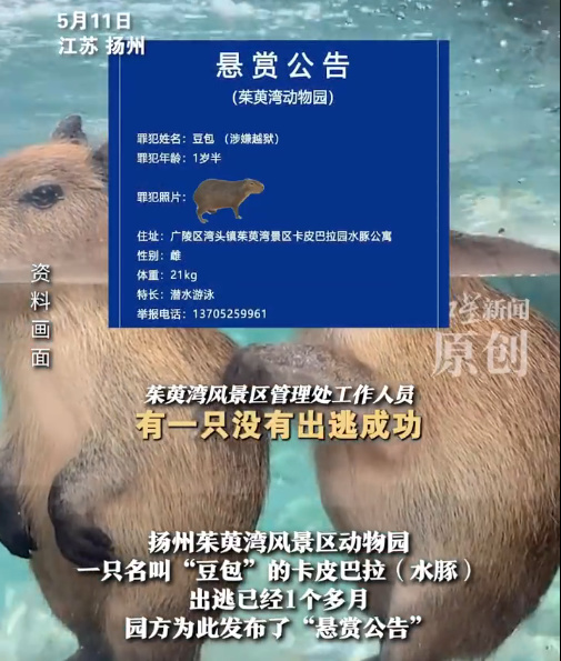 5月11日上午,江蘇省揚州市茱萸灣風景區管理處發佈一則懸賞公告,稱茱萸灣動物園的卡皮巴拉(水豚)“豆包”於2025年4月3日出逃,夥同家庭成員“霸總”“躲躲”集體越獄,“霸總”、“躲躲”已“依法逮捕歸案”,目前“豆包”仍在逃,至今已達40天。動物園懸賞:凡提供豆包出逃有效信息者均可獲贈茱萸灣門票一張。