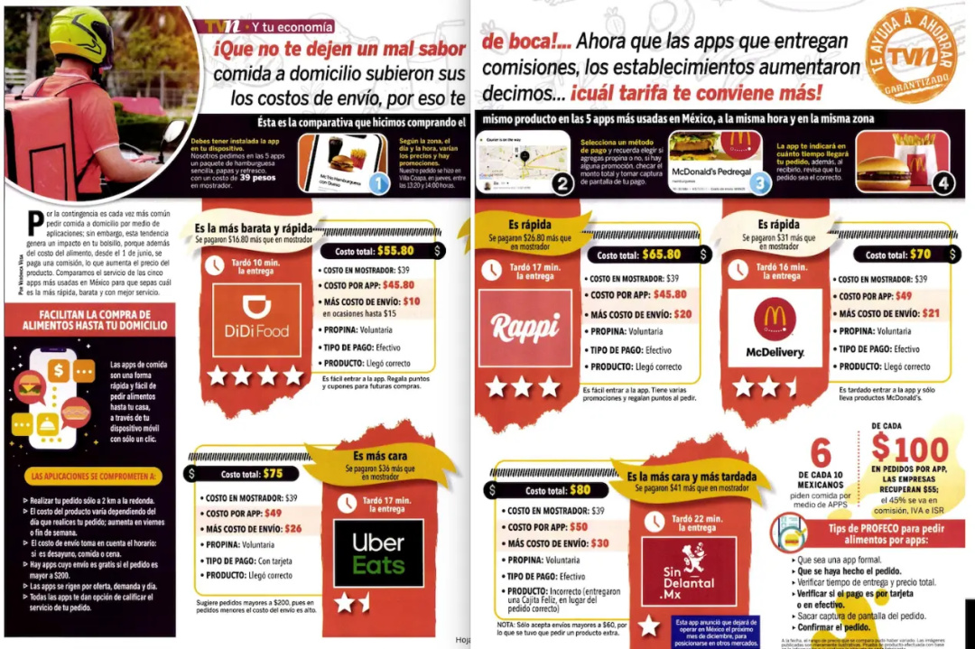 2021 年的時候,墨西哥最受歡迎的雜誌之一《 電視小說 》發了一期測試,他們把當地 5 家外賣平臺拉到一起大亂鬥。
