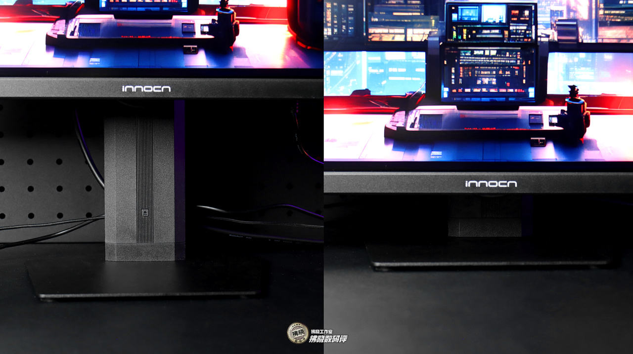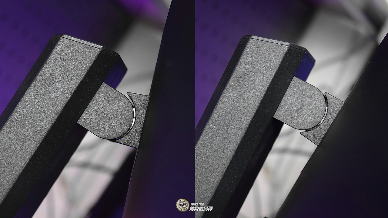 与该品牌旗下一些采用支架内嵌式线束收纳方案有所不同,联合创新27G2T电竞显示器的支架后侧安置了一个非常巧妙的卡扣设计。虽说在外观上显得要更为粗犷些许,但这样做则拥有更好的拆卸简易性,无伤大雅。尤其对于像我这种显示器靠墙安置,不在乎背面细节的使用者来说,这种外挂式线束收纳卡扣的使用体验则要略好于内嵌式。