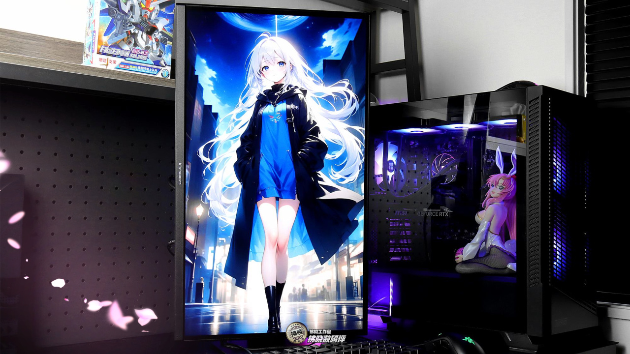 对于一些码农和做设计的朋友来讲,屏幕正负90度的垂直旋转调节必须得有。相比一些屏幕只能靠拆装支架才能完成的竖屏操作,27G2T只需将屏幕稍许上仰即可直接进行旋转。比如像我这种平时喜欢在桌面上布置多个显示器的极客玩家来讲,在一旁竖起的屏幕上放一张好看的图片,也相当赏心悦目。