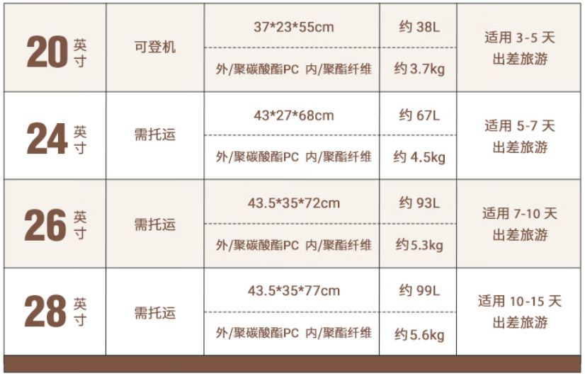 我一般選箱子的尺寸都是優先考慮20寸的,主要是能上飛機,不用排隊託運,沒有等待取行李的時間,出差或者旅行儘量少拿東西。像24寸以上的,又塞滿的行李箱,遇到樓梯、臺階什麼的,它是真提不動啊。