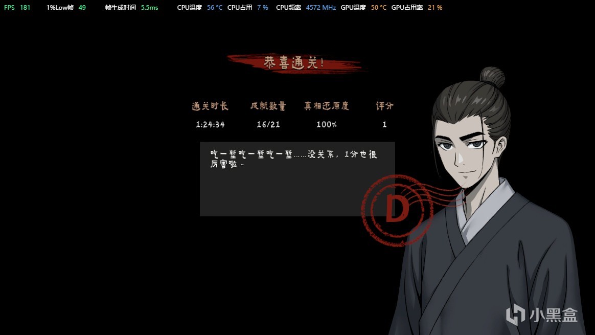 總結一下就是遊戲劇情很不錯,就是流程太短了。剛漸入佳境結果就到頭了, 畫面也很優秀,沒有配音實在可惜。遊戲有驚悚自然也有詼諧,例如遊戲內的一些成就達成的條件。當姑姑打來電話,你故意不接的時候會彈出來成就。當你在小賣部下棋的時候也是如此,我們還是一個AAA級開鎖大師和肺活量達人。遊戲的解密難度適中,符合像我這樣的正常玩家。最後我也想知道姑姑心裏到底在想什麼,對於姑姑來說真的只是單純復仇的工具嗎?