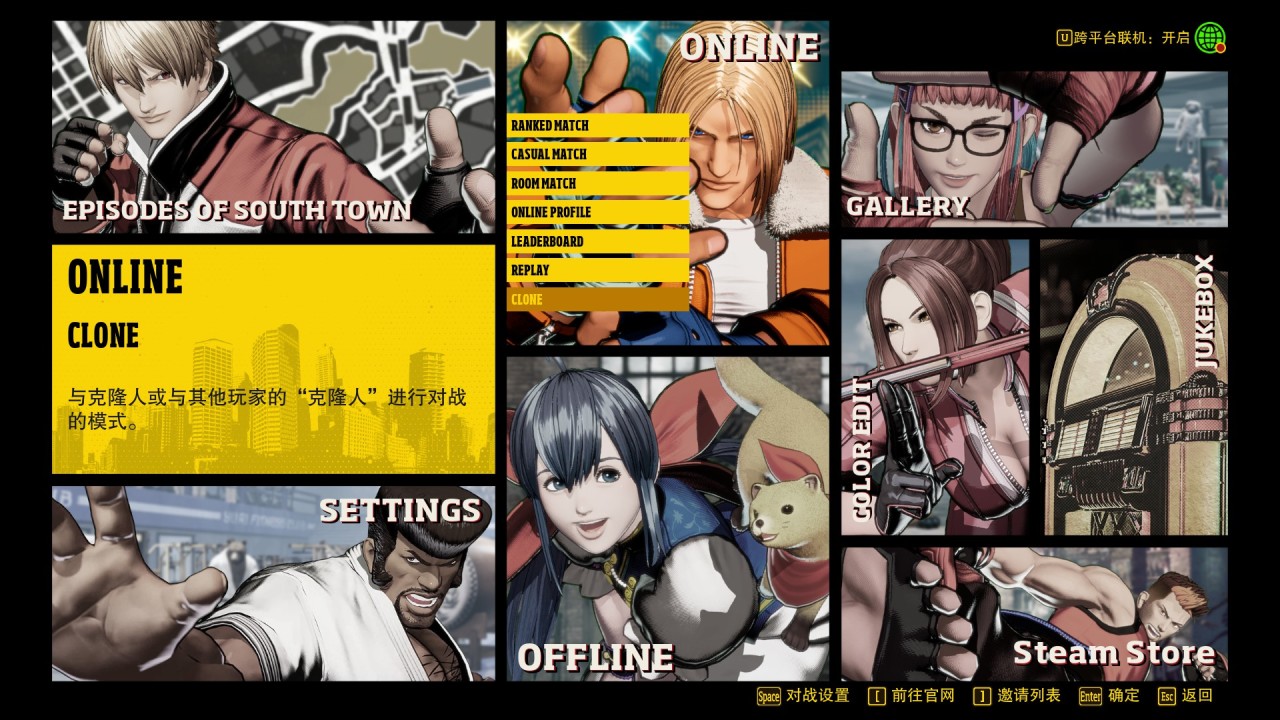 《饿狼传说:群狼之城》除了有侧重于练习的OFFLINE模式,还有功能十分完善的ONLINE模式。在ONLINE模式里,排位赛、房间对战等经典的模式可谓应有尽有,还有一些比较有新意的比如克隆人模式。对自己水准有信心的玩家可以在这里大展身手,而新手也可以在这里查看其他玩家对战的战斗录像来进行学习。