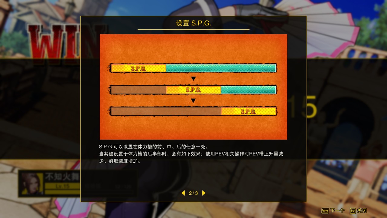 这里涉及到的REV其实就是本作的另一个特色系统了,这里先按下不表,回到S.P.G.。可能有的小伙伴会说:“既然S.P.G.会给玩家带来加持,那肯定是设置在血条前段更好吧?这样在血量很健康的时候就可以触发效果了。”但也是一种思路,对于新手来说确实这样更实在,但这个游戏的设计肯定不会这么简单,而是会给玩家一个取舍,这样就产生策略博弈与玩法深度了。S.P.G.还有一个设定,就是如果你把它设置在血条后段,那么REV槽的的增加速度会减慢、减退速度会加快,而这个REV槽是越空越好,满了之后会给玩家带来DEBUFF。所以将S.P.G.条设置在血条后段是可以享受这个正面效果的,这也就意味着,如果你对自己的操作有信心,你可以通过将S.P.G.条设置在血条后段来获得更多收益,但缺点自然就是你在血量健康的时候享受不到这个,果然高手的战术思想就得是“血残了才更强。血不残不会玩”才能玩得更刺激。
