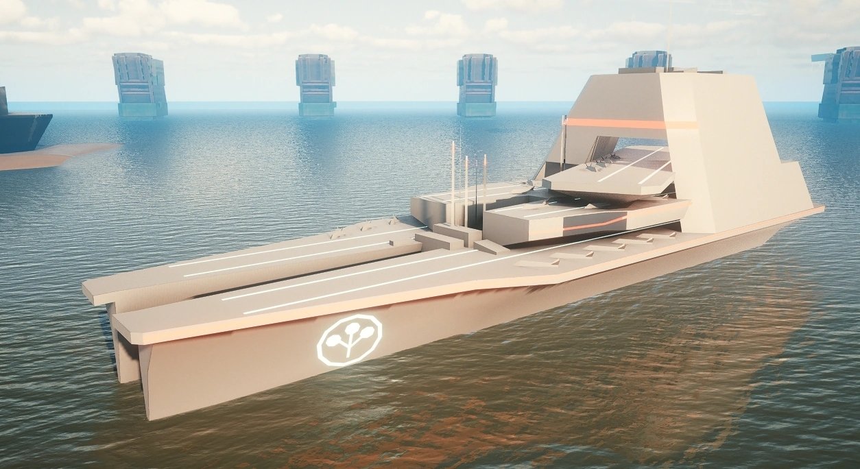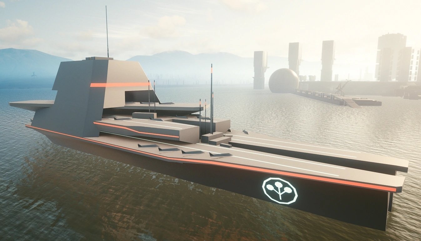 3. Additionally, the ship depicted in-game is noticeably different than that seen on Info Flash and the artwork; while it retains the twin bows and three-tiered flight deck, the carrier's superstructure is significantly larger and set over the topmost flight deck tier, instead of offsetting to one side as the art depicts.