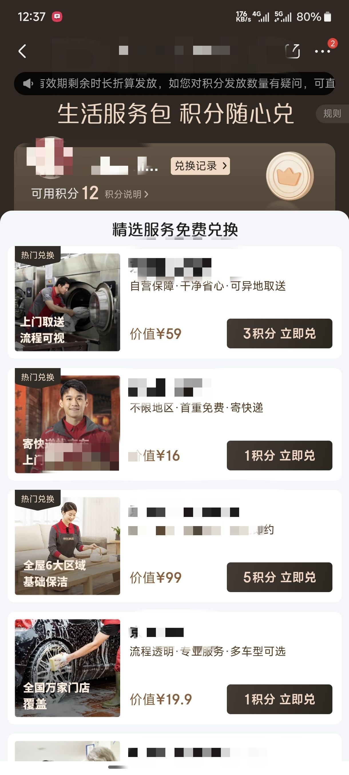 购买结束后点击“生活服务包”,你会得到12积分。这12积分就是你免费开卡,甚至小赚的关键!