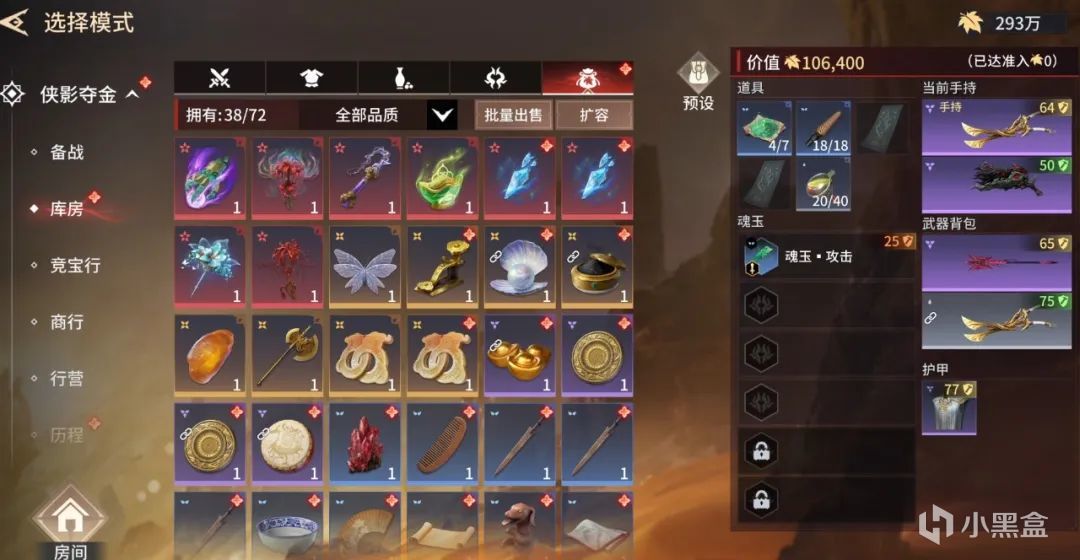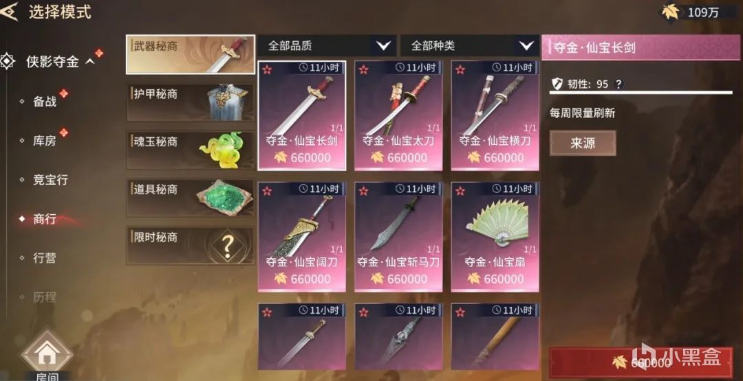 1、物资分类:可在竞宝行出售和购买武器、护甲、魂玉、道具、遗珍等物资。