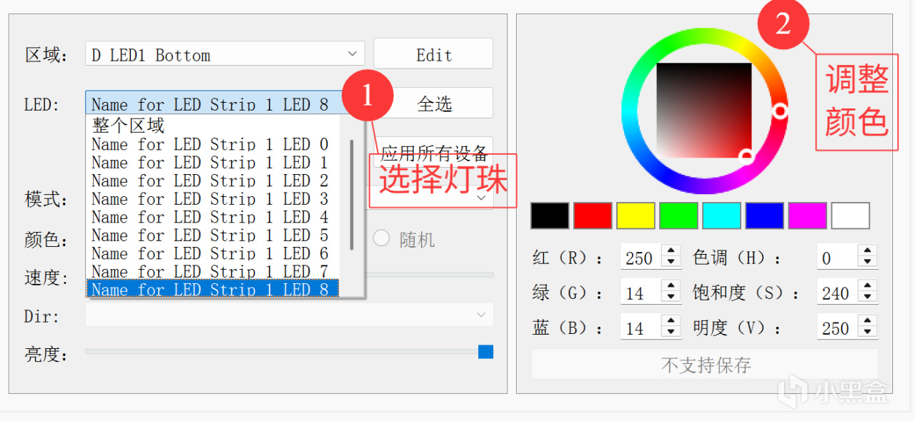 然後設置好數量後,在LED處選擇燈珠,這裏選擇了8號,然後在右邊調整顏色,我調整成了紅色,於是乎我的主機的底部接口的8號燈珠便亮了起來: