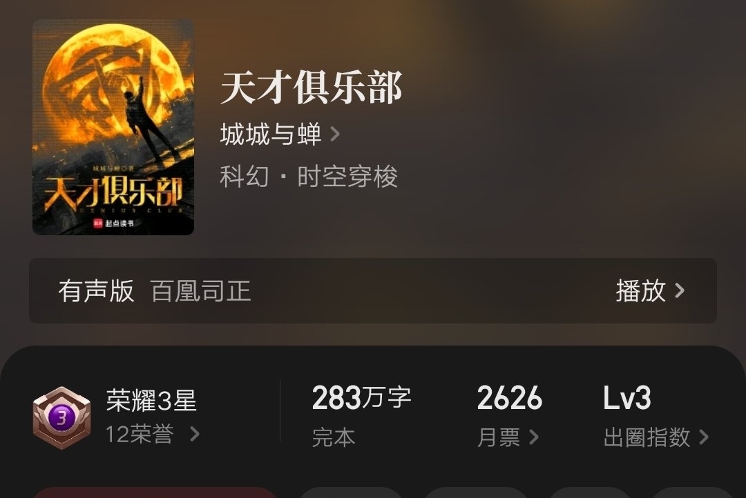 这本小说科幻与悬疑推理融合还算不错,以“预知梦”串联600年时空,构建双线叙事。主角林弦的保险柜谜题、天才俱乐部的跨时空博弈,第一章开篇堪称“电影级质感”,完全能抓住读者的吸引力。并且城城与蝉是去年才来起点证道的作者,第一本书就10万均订,影视、动画、实体书版权也是全售出,填补起点这个分类的空白。而且他又比较年轻,起点这几年就比较喜欢捧红这些年轻有实力的作者,比如去年的季越人,并且一本10万均订基本是近两年拿下大神的最稳定的条件,所以他今年也是基本稳定拿下大神名额的。