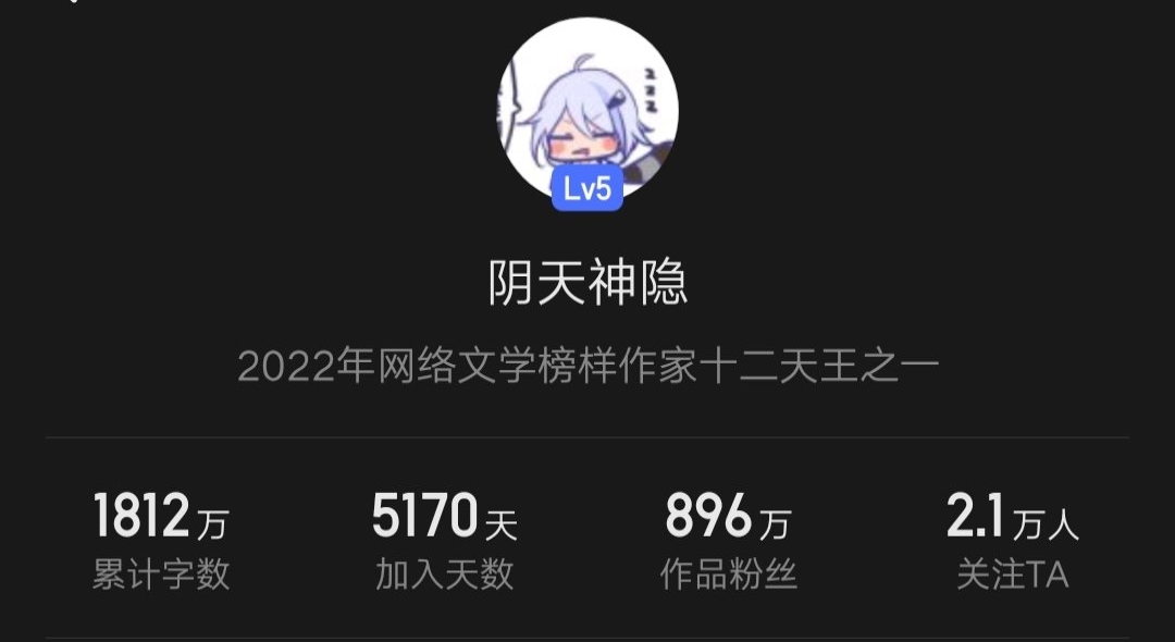 阴天神隐同样也是十年的老作者,2022年就凭借《高天之上》拿下了那一年的12天王,接着新书《天命皆烬》虽然字数才200万,但更新和成绩比较稳定,再加上前作《怪物被杀就会死》和《燃钢之魂》的持续影响力为其加分。而且跟他同期的作者已经好几位大神了,以他的水平就算今年拿不到名额,过两年也绝对能拿到的。
