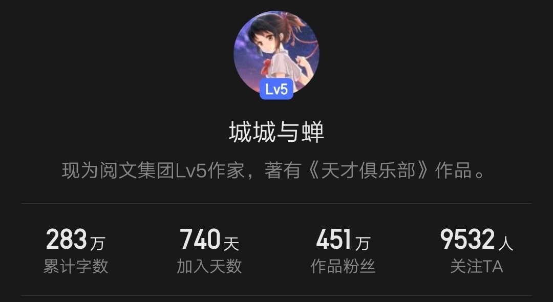 代表作:《天才俱乐部》(科幻悬疑,均订破10万,第35届银河奖最佳网络文学奖)。