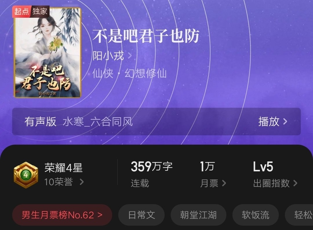代表作:《不是吧君子也防》(多女主仙侠,均订破4万5,荣耀四星)。