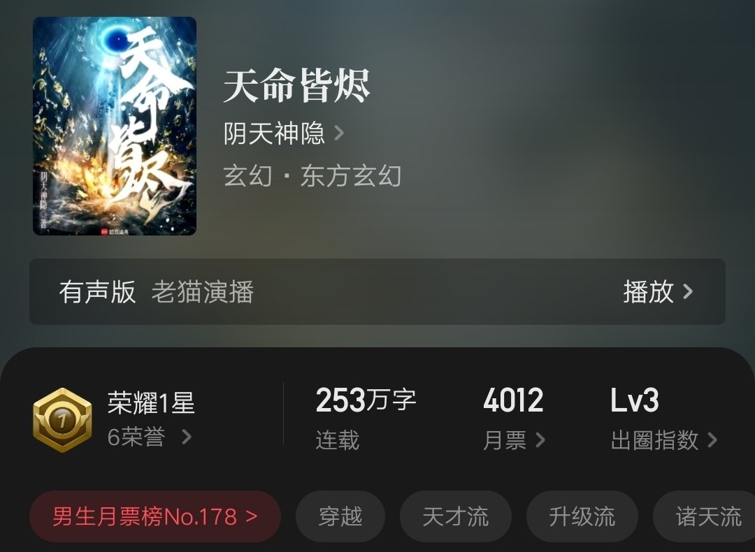 代表作:《天命皆烬》(玄幻武道,均订破万)、《高天之上》(奇幻分类这两年代表作)。