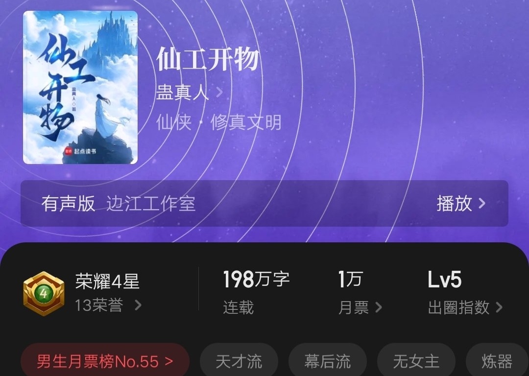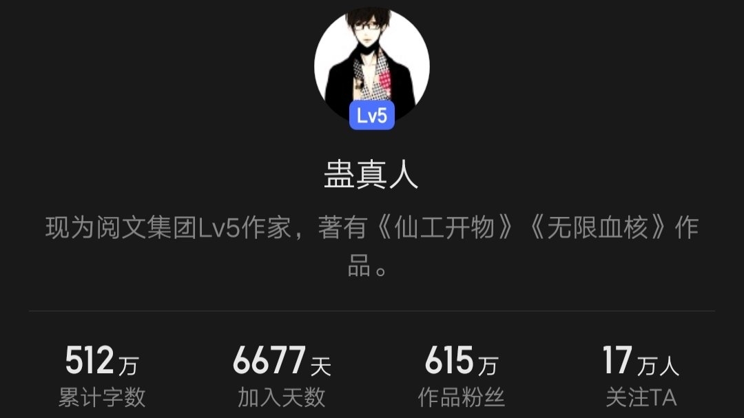 蛊真人也是起点写作十几年的老作者了,虽然只有两本书。去年也是拿下了12天王,擅长构建冷酷世界观,他的《仙工开物》用机关术重构修仙体系,但是第一卷后剧情拖沓,机关术描写也不好,战力和打斗场面也很崩坏,近期更新更是非常不给力,经常断更或者注水。不过近两年男频也没有什么有实力的lv5作者了,如果给他大神名额的话也勉强说得过去,看起点愿不愿意吃这波流量了。
