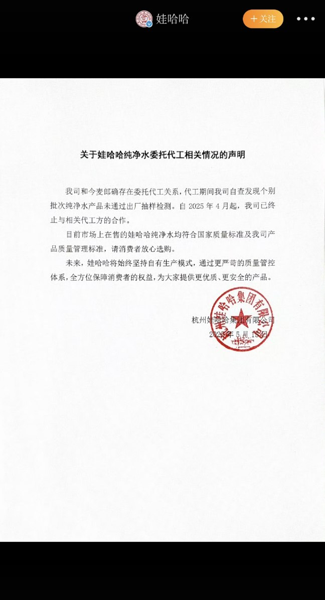 娃哈哈集團聲明:自2025年4月起,已終止與相關代工方的合作