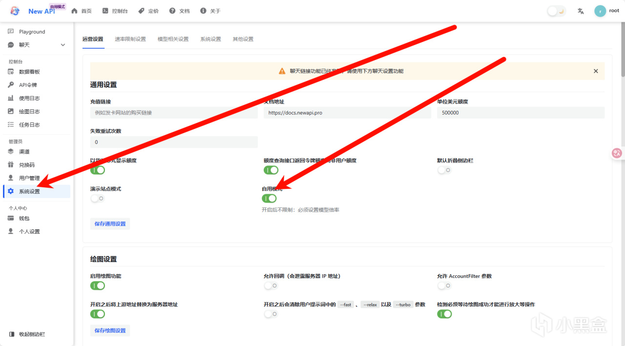 为了省去手动配置每个模型价格的问题,我们来到系统设置打开自用模式。失败充实次数可以配置一下,如果多个渠道具有相同名的模型会自动去重新请求的。