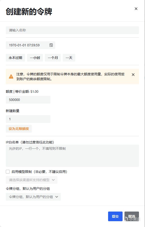 点击左侧API令牌,名称随便输入,额度看你自己需要或者直接无线额度,令牌分组不设置的话你是什么级别用户那就是什么级别的令牌,比如你是root 那不设置令牌级别就可以访问所有的模型,普通用户则是只能普通组。完成后提交。