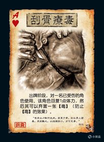 刮骨疗毒:出牌阶段,对一名已受伤的角色使用。该角色回复1点体力,然后其可以弃置一张【毒】(以此法弃置【毒】无须失去体力)。