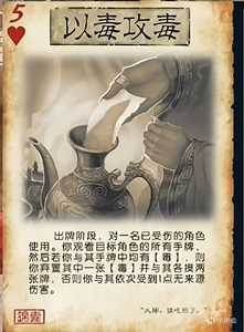 以毒攻毒:出牌阶段,对一名已受伤的角色使用。你观看目标角色所有手牌,然后若你以其手牌中均有【毒】,你弃置其中一张【毒】并与其各摸两张牌,否则你与其依次受到1点无来源伤害。