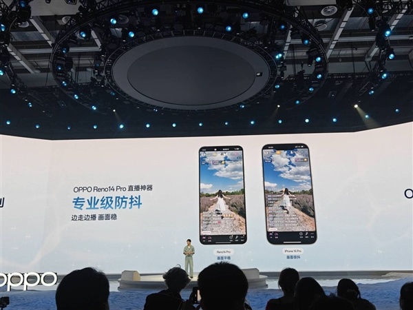 並且Reno14 Pro採用專業級直播防抖,擁有自研EIS防抖算法+主攝長焦OIS硬件級防抖,邊走邊播,畫面不抖,防抖效果對齊iPhone 16 Pro Max。