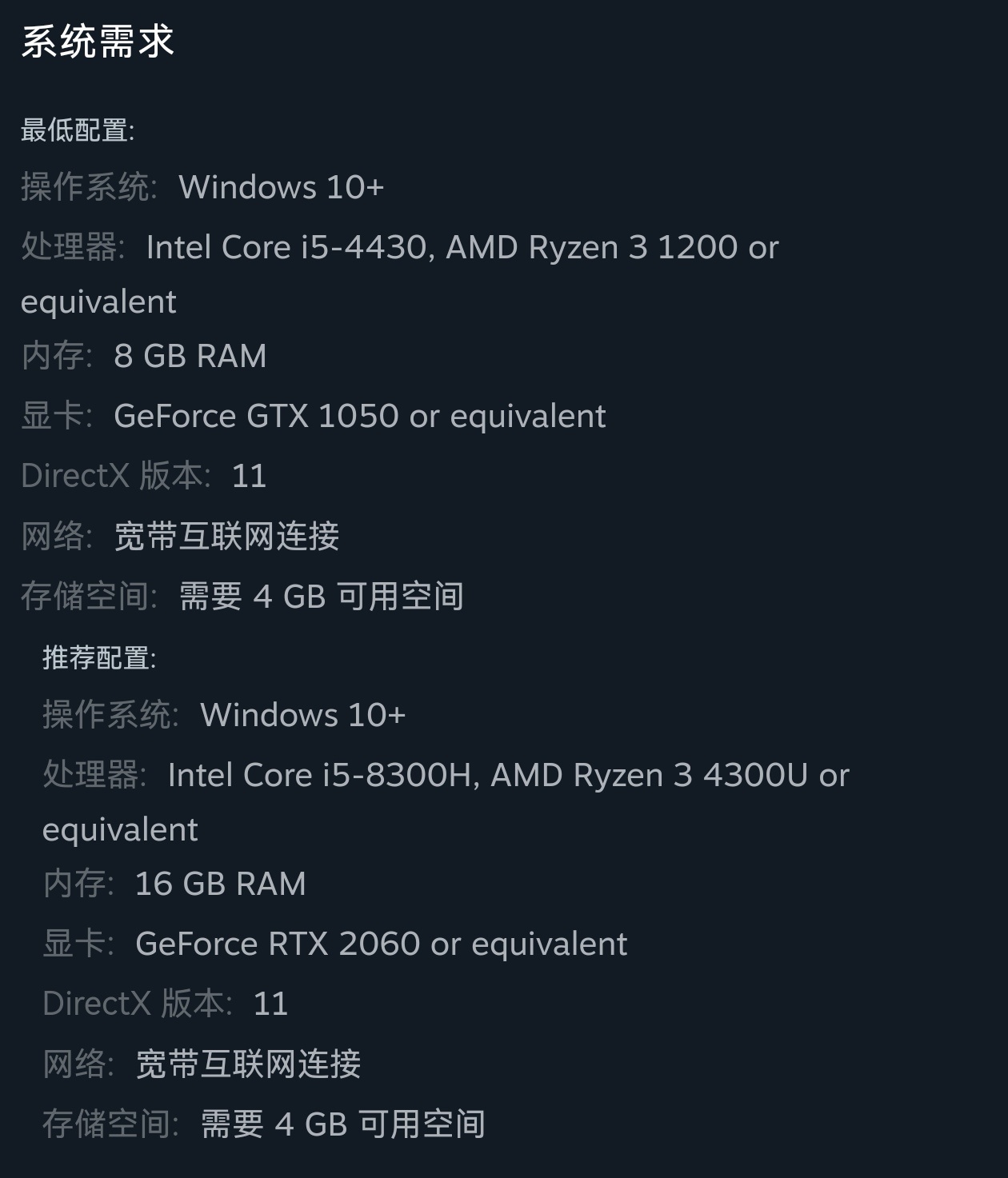 遊戲配置要求: