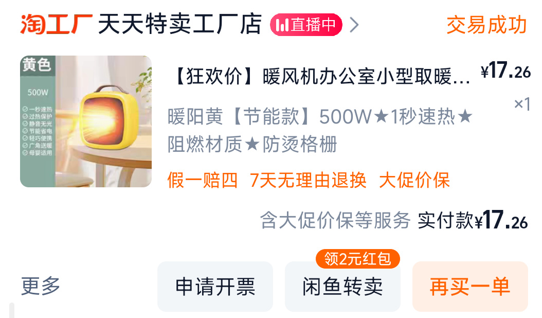 优点:功耗不高,取暖足够,而且足够便宜,建议找个二十块钱左右的。