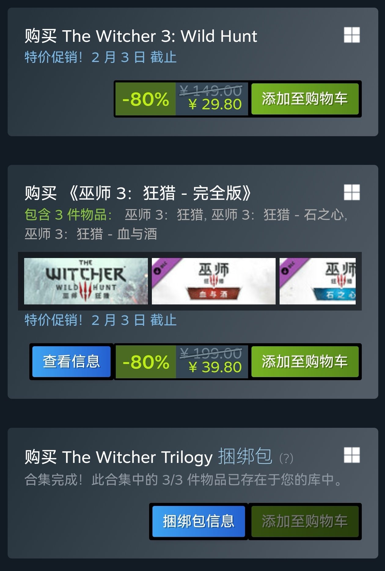 记住不要买第三个,因为第三个是巫师123的捆绑包,这里面的巫师3是标准版,但是如果你买了巫师3的标准版,你再想买完全版,是不支持补齐的,所以说一步到位是最省钱省事的。