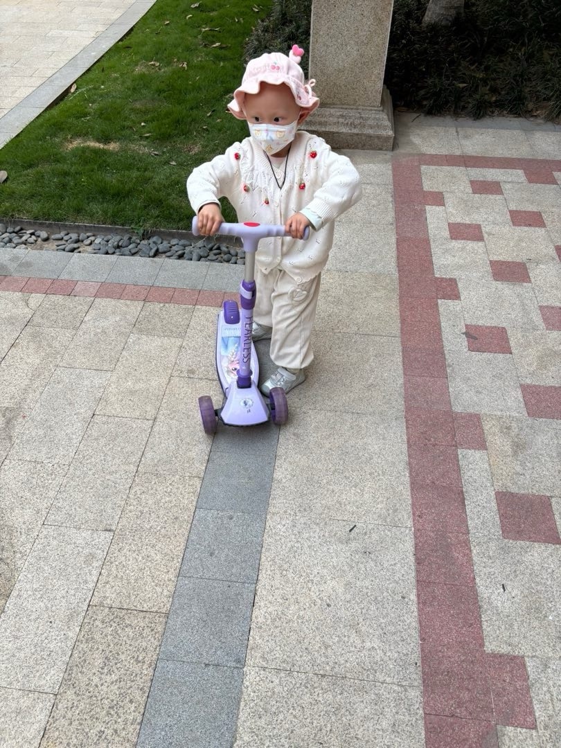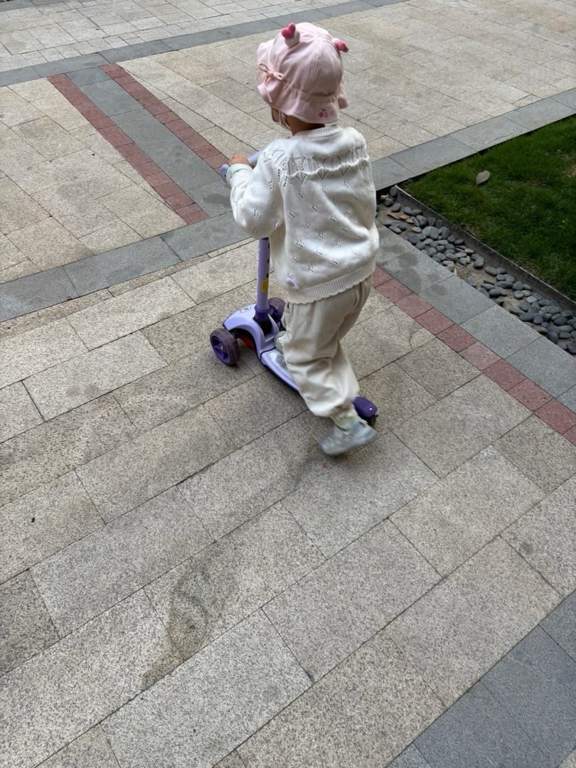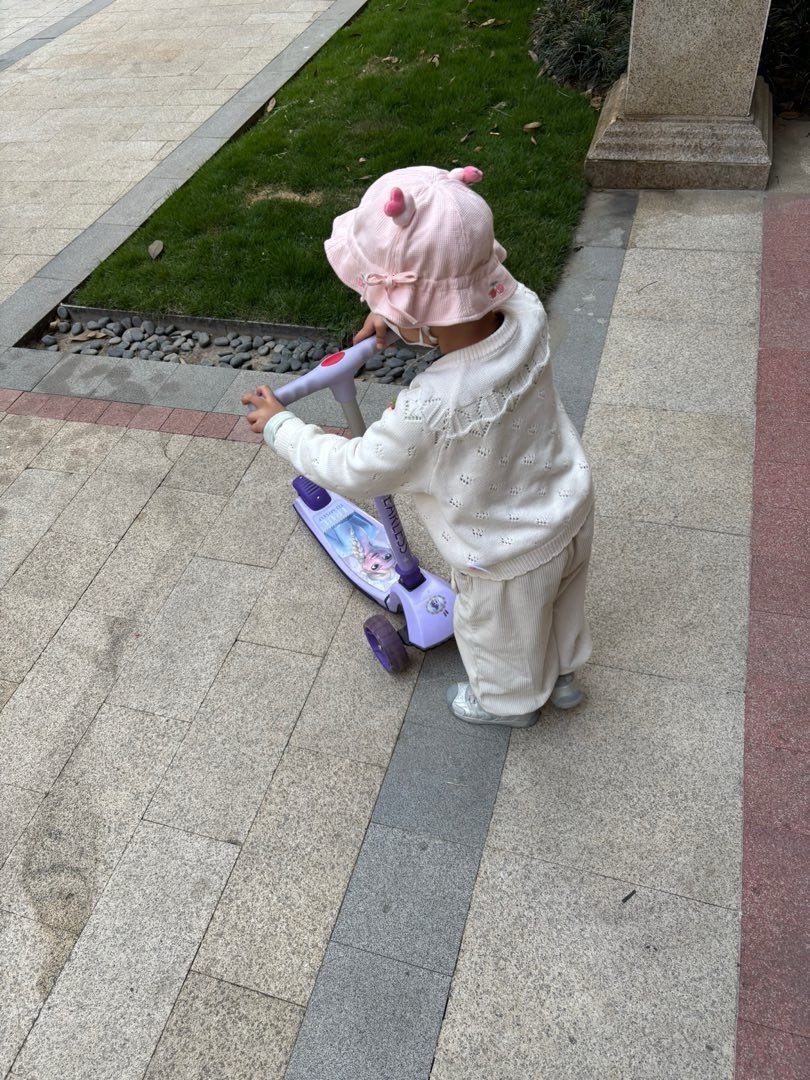 现在晚上下班又可以像往常一样带着筠崽散步了,又在骑在爸爸的头上出门了,现在筠崽骑滑板车的技术大涨,不过,呃,转弯还有点困难,需要刹车后再下车手动转向,只能说还得再练,哈哈