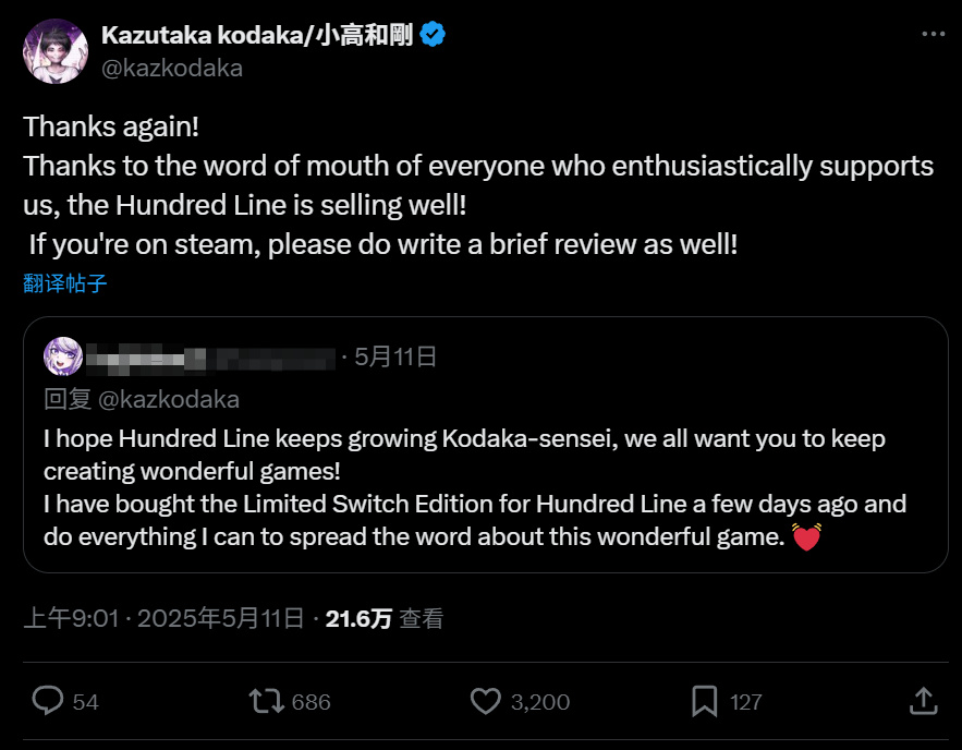 直到5月11日,游戏发售半个多月后,高强度营业的小高才终于发布了“胜利宣言”——他在推特上宣布《百日战纪》“卖得很好”,同时还不忘再撺掇大伙去Steam页面打点儿好评。