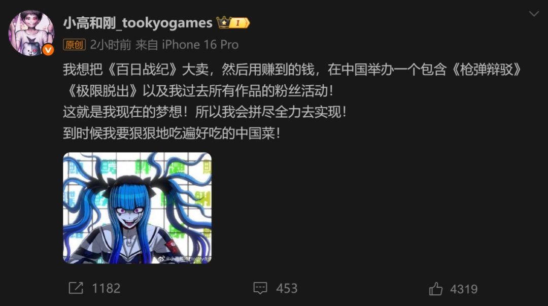此事在去年小高和刚入驻微博时,评论区铺天盖地的“放飞小高”中亦有记载,虽是吉光片羽,却也足以得见这位制作人当年的人气之盛——我是说,如果小高愿意,他完全可以靠量产“弹丸论破”系列的续作和衍生作吃一辈子。