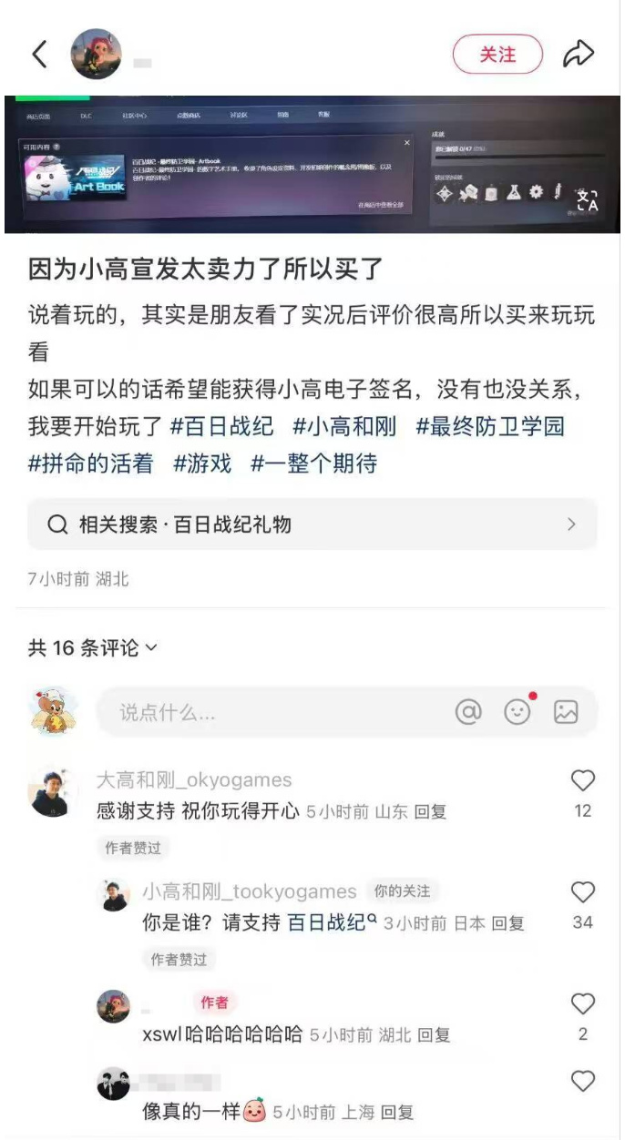 与此同时,小高也不忘在微博等社媒的官方媒体上猛力狂刷存在感,前一天感谢Steam购买占比最高的中国玩家鼎力支持,后一天号召大家去评论区打几个好评,过两天又许愿《百日战纪》大卖后用赚到的钱在中国开小高专题粉丝见面会,狂炫中国美食……