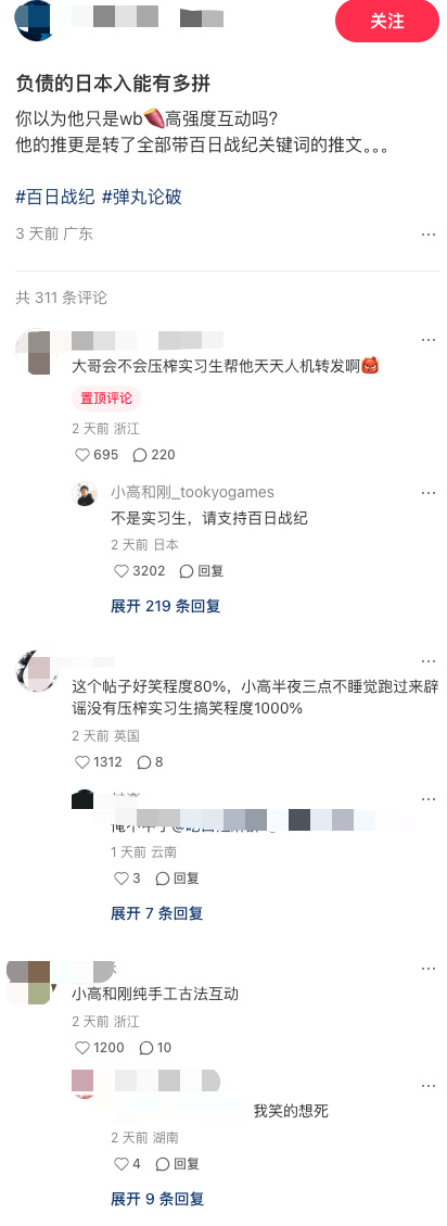 如此高强度的互动,让大伙不禁怀疑这家伙是不是在压榨负责运营的实习生,让他高强度视奸#百日战纪的Tag……于是,凌晨一点多,小高本人亲自出马,对“质疑”进行了回复——