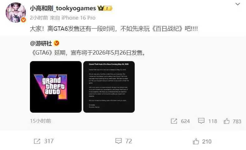 就连《GTA6》官宣跳票时,小高都不忘出来小蹭一波——民那桑,等待GTA6的时候,不如先来玩玩《百日战纪》吧!