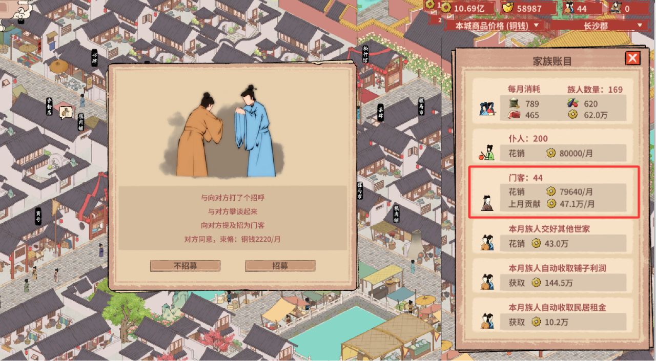 光靠主角一人自然无法赚取万贯家财,可以招揽寒门子弟。查看来来往往的NPC,挑选出高商才的NPC,安置到住宅即可全自动打工,有种抓帕鲁的感觉。