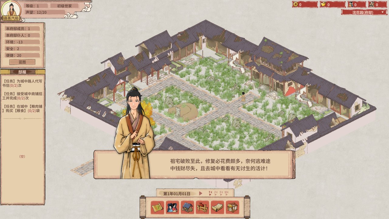 游戏没有明确的主线剧情或者最终目标,像是一个玩法开放的历史沙盒。可文可武可商可耕,选择你的家族振兴之路。