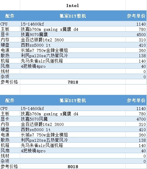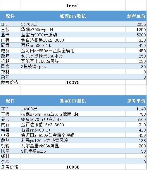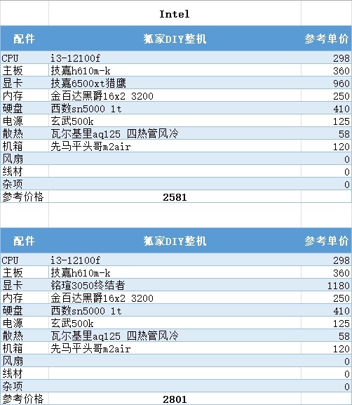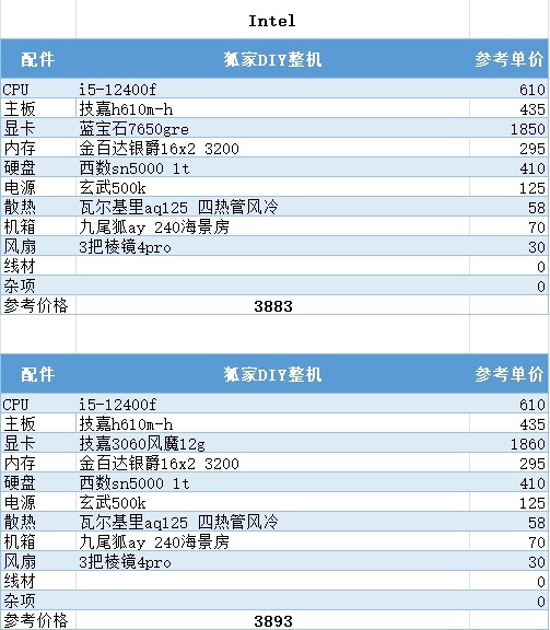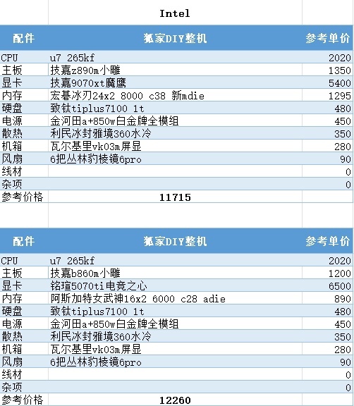 以下配置单均分为au a卡、iu a卡、au n卡、及iu n卡的搭配,cpu除英特尔ultra系列默认为盒装外其它均为散片,废话不多说,下面直接进入主题: