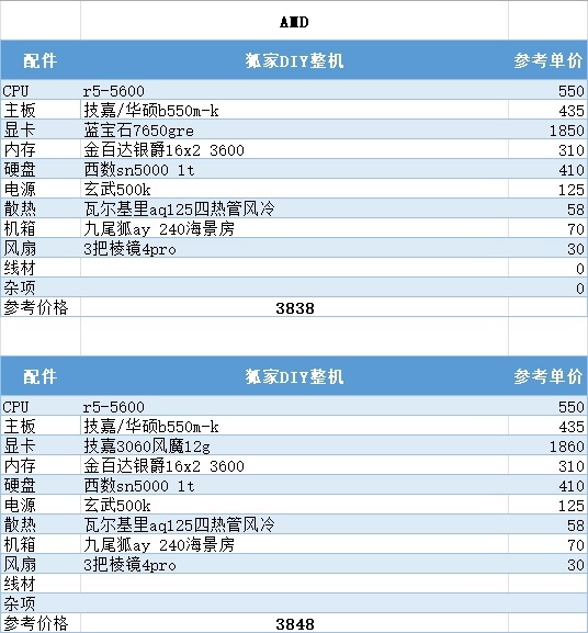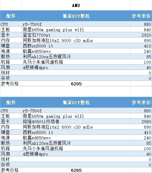 6000元预算可以说是大多数人的预算了,这个价格可选项不少,可以继续使用性价比更高的5600搭配7800xt能摸到4k门槛,要么上更新平台的7500f搭配供电较为充足的主板为以后升级cpu做准备,这一代am5平台至少会使用到2027年,也可以直接上9600x加7650gre过渡一段时间等到显卡降价(虽然希望渺茫)的时候更换更好的显卡