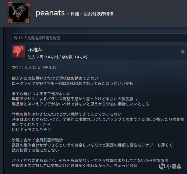 个人虽然挺喜欢但当前版本不推荐 即使喜欢Roguelike也建议先试玩DEMO版 首先沙罗过强导致其他角色黯淡 原以为是早期体验版平衡性不足的锅,没想到正式版也...。虽说是正式版但也不是没有更新可能,期待后续调整 喜欢竹虎的性能但打BOSS时又弱得让人提不起劲 时雨暂时摸不清用法,不过如果能整体提升攻击力、增加被动强化项目、扩展强化幅度的话 应该能成为不错的角色 包括沙罗在内全员武器设计平庸 虽说能自由组合武器很有趣,但武器种类、特色与协同效应都太薄弱 根本提不起反复尝试的兴致 虽然有弹反机制,但敌人很少使出可弹反的招式形同虚设 对前期BOSS有效,后期完全用不上,实在可惜.....