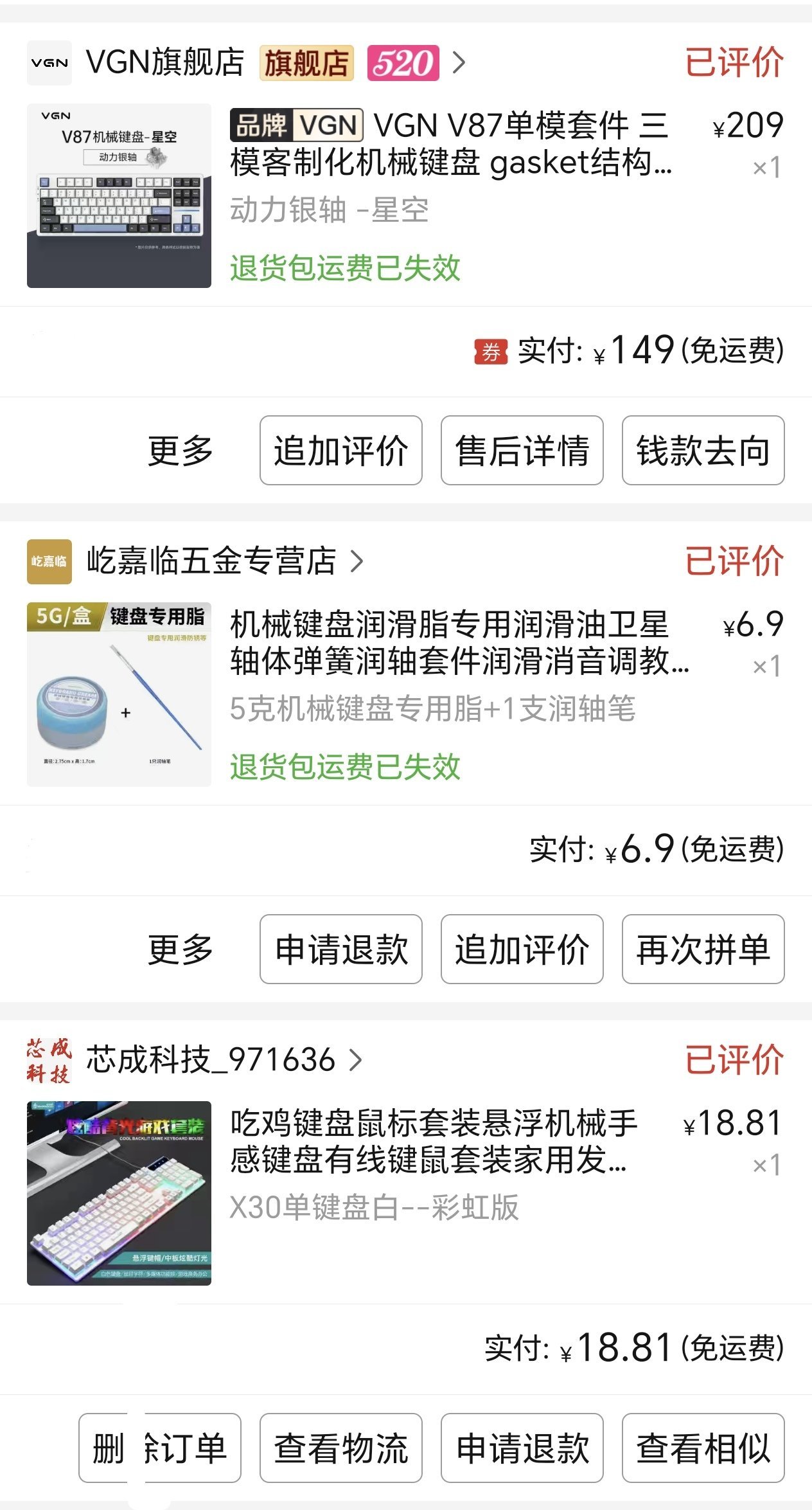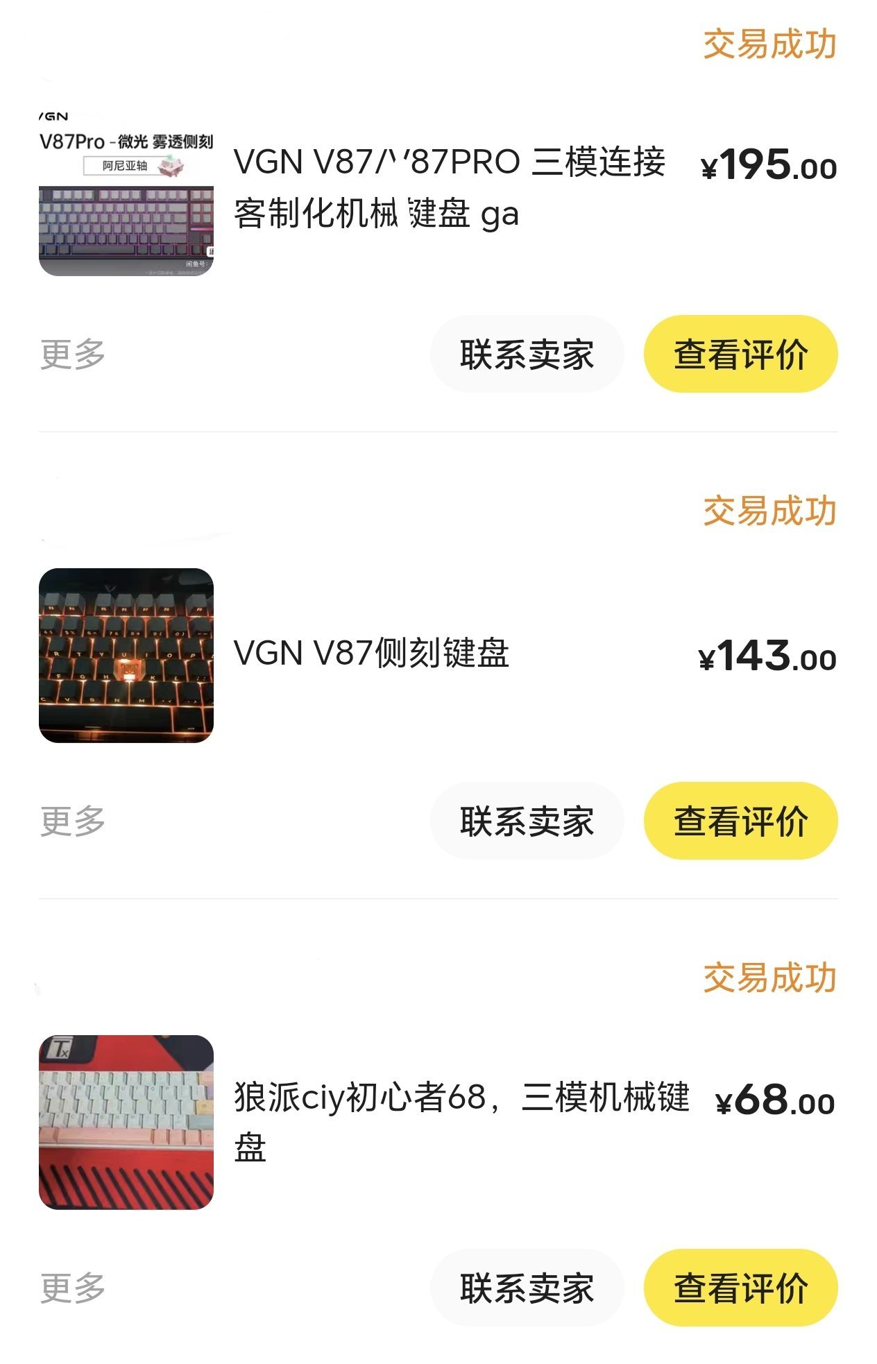 直到后来有一天……VGN和狼蛛先后在价格上开卷,机械键盘的市场也就慢慢变天了。还记得那几乎是23年10 11月的样子,VGN V87发售了,149的价格,而且星空的外观和f87星际迷航几乎一模一样,之后狼蛛f87的乌野橘光也发售了,同样卖149!当年狼蛛的口碑比V家好很多,毕竟品控和售后几乎就是全部,但是奈何乌橘实在太丑了,没办法,俩都买了……