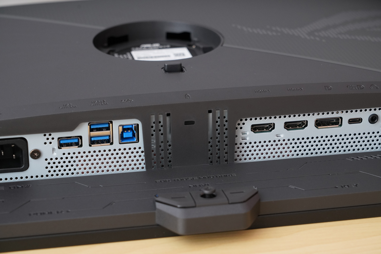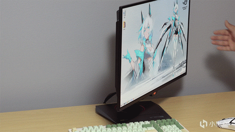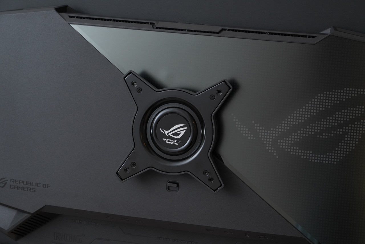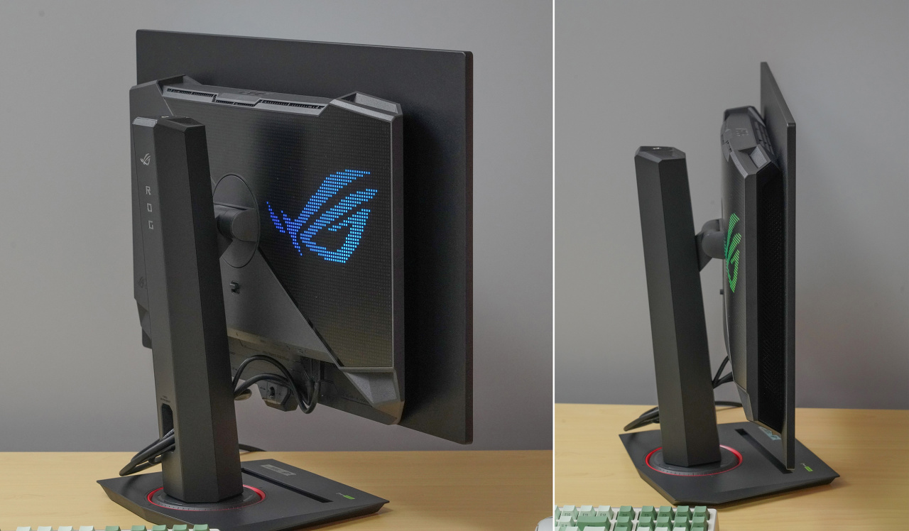 最後再介紹一下這臺顯示器外觀和設計功能方面。從側視圖和後視圖可以看到這臺顯示器的面板極薄,而且背後還有一個支持神光同步的ROG敗家之眼的炫彩呼吸燈,開啓後感覺氛圍感就來了。